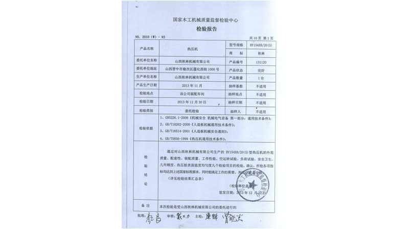 BY21型熱壓機、BY624×8/16、BY154×8/20(5)通過國家木工機械質量監督檢驗中心檢驗